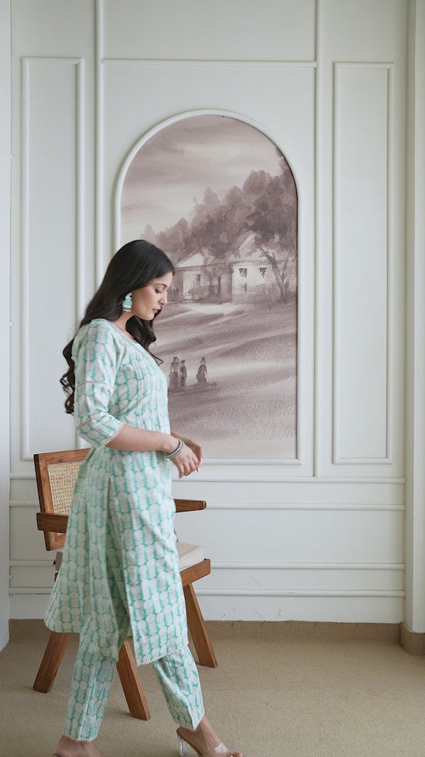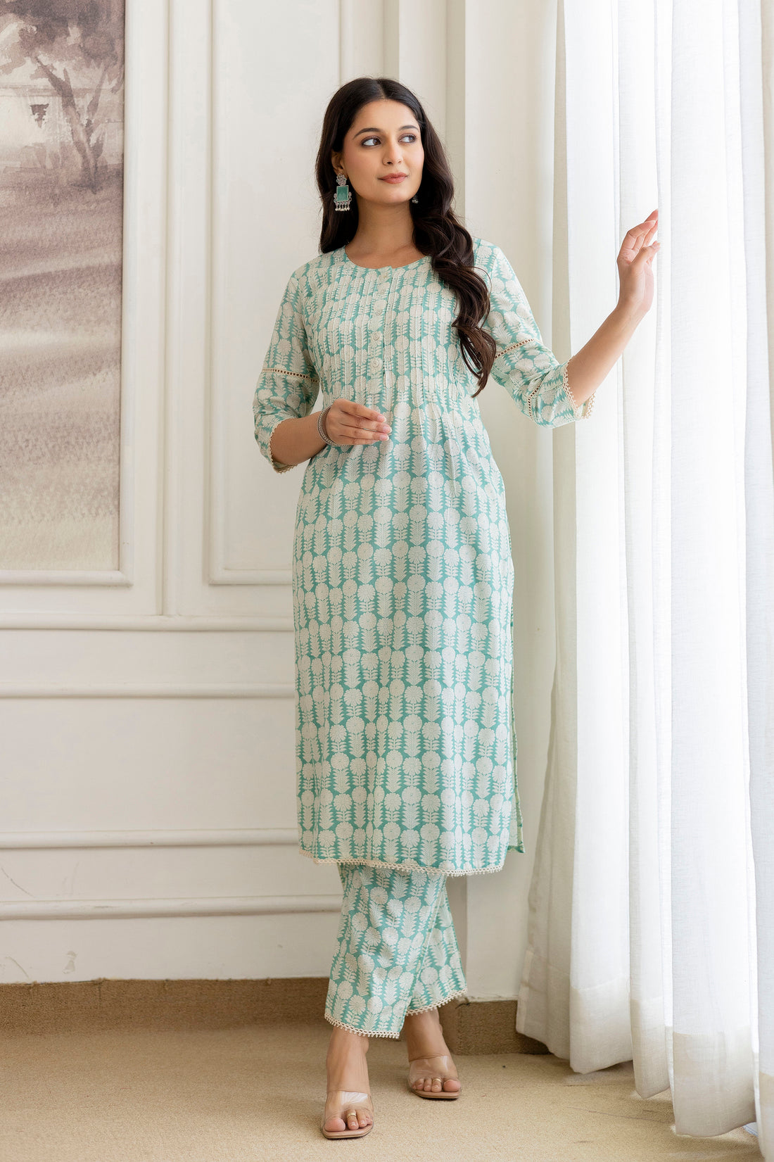 Teal Green Printed Cotton Kurta Set with Dupatta