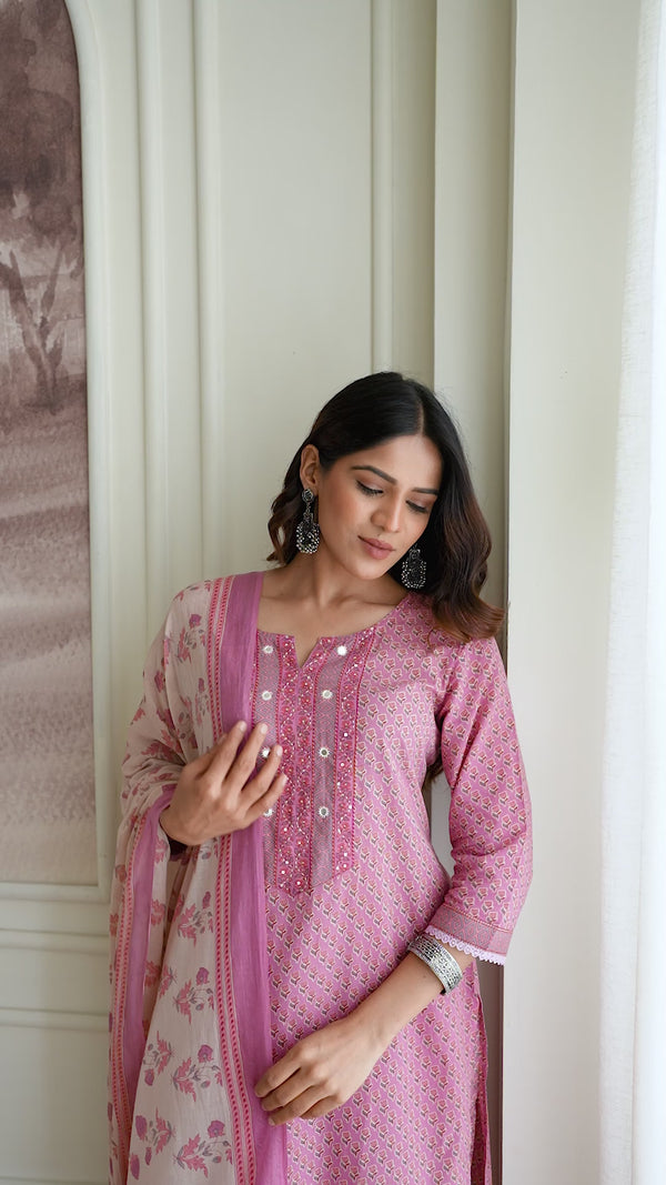 Pink Floral Printed Cotton Kurta Set
