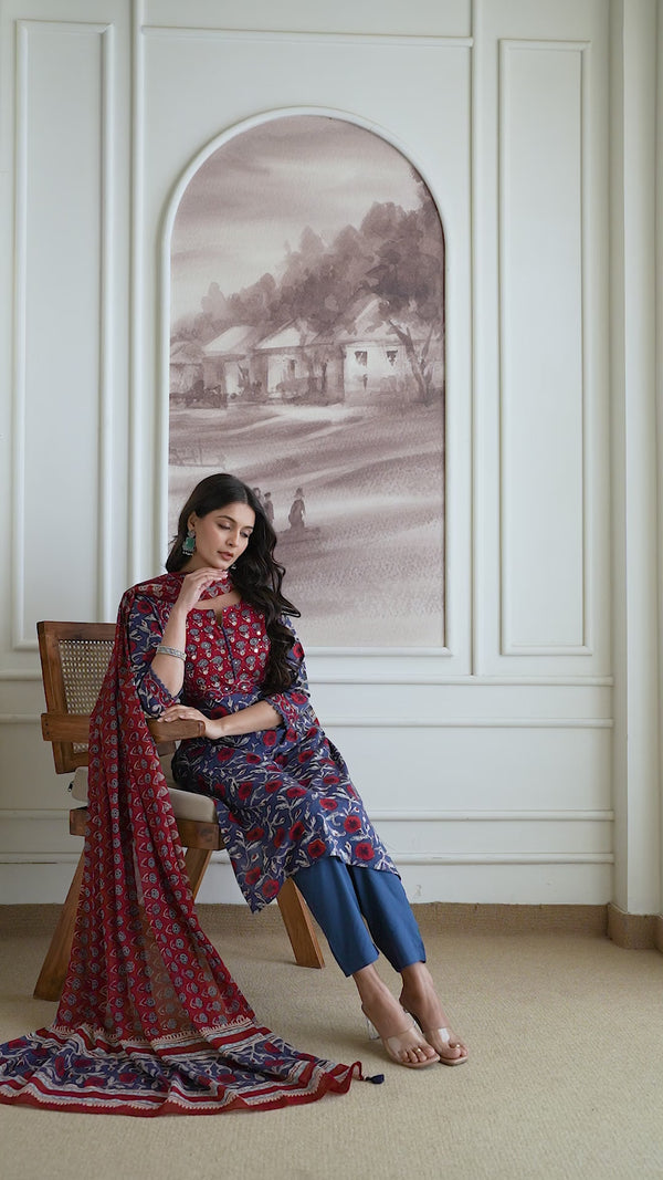 Red & Blue Hand Block Printed Cotton Kurta Set with Dupatta