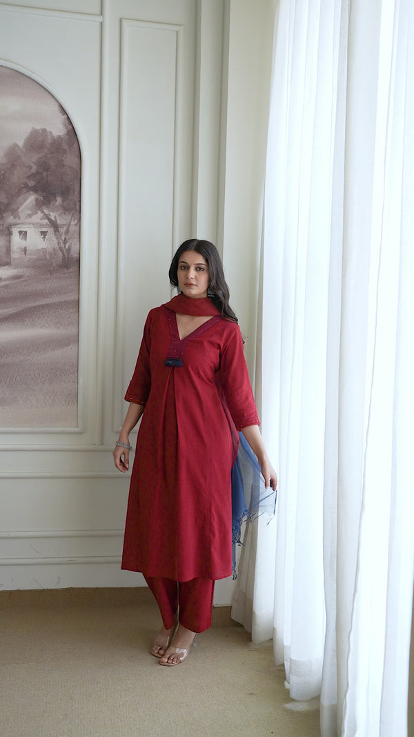 Maroon Cotton Slub Kurta Set with Red Ombre Dupatta