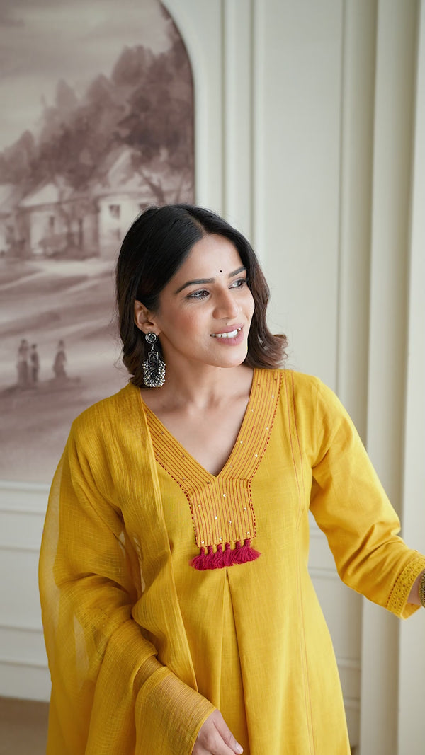 Mustard Printed Cotton Kurta Set with Dupatta
