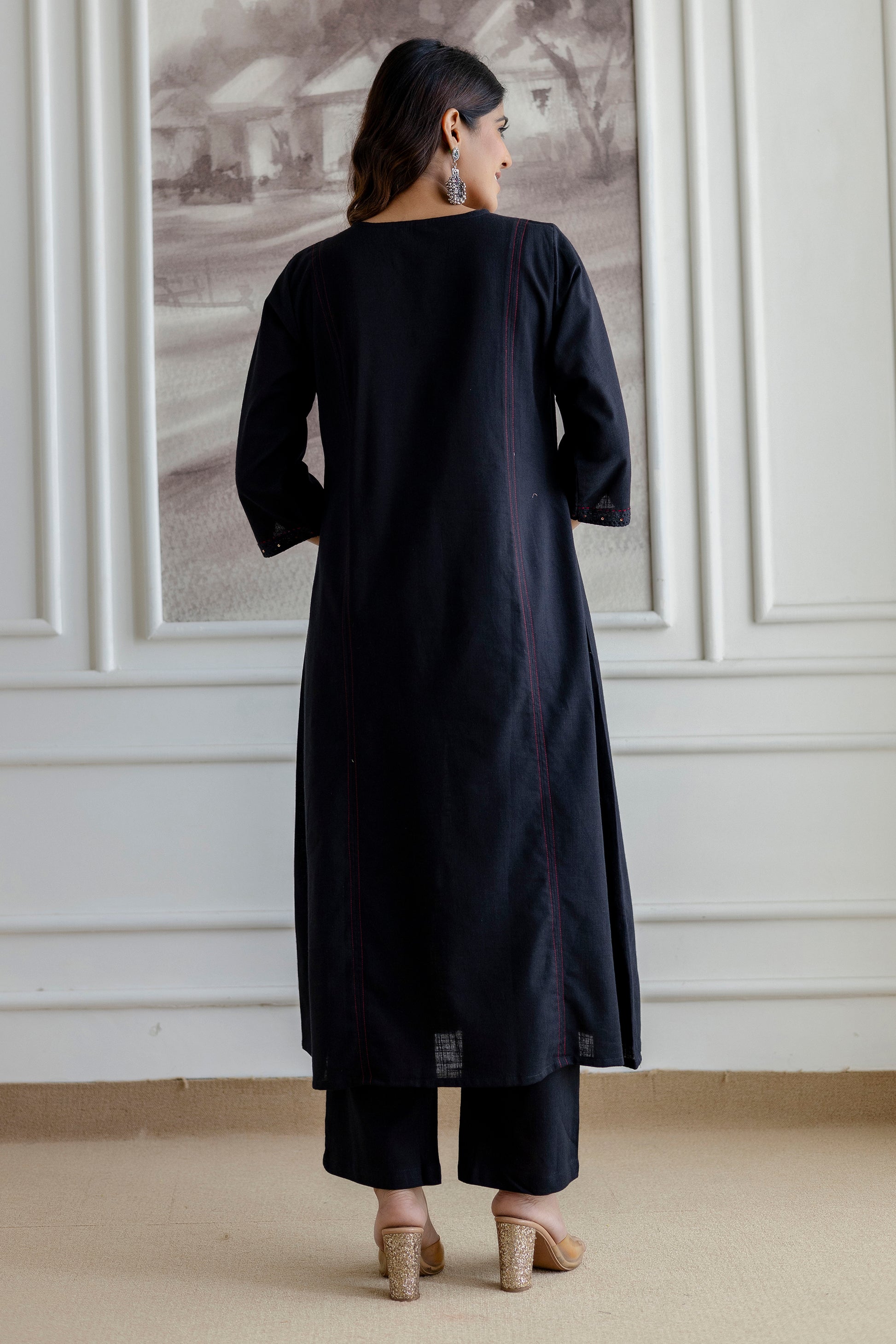 Black Cotton Slub Kurta Set with Red Ombre Dupatta