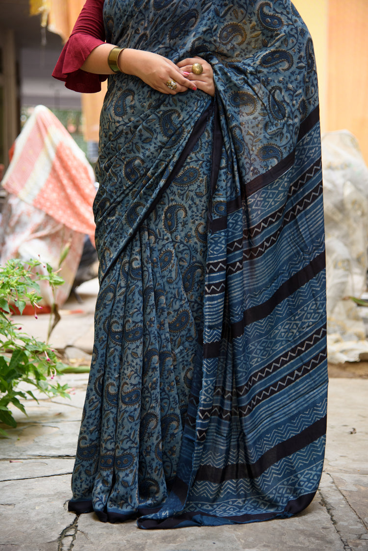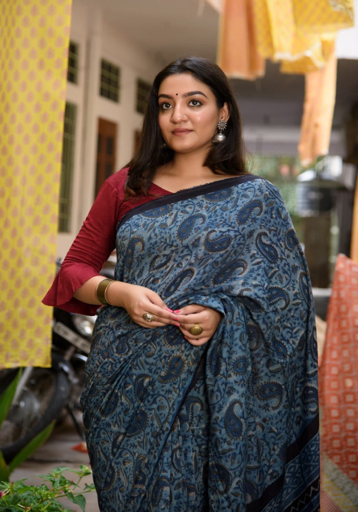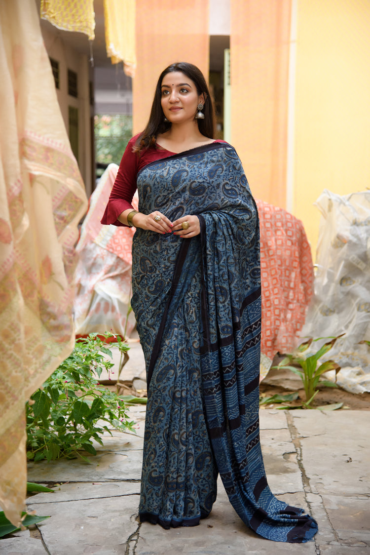 Modal silk saree in natural vegetable floral print in indigo and natural dabu color with floral print blouse.